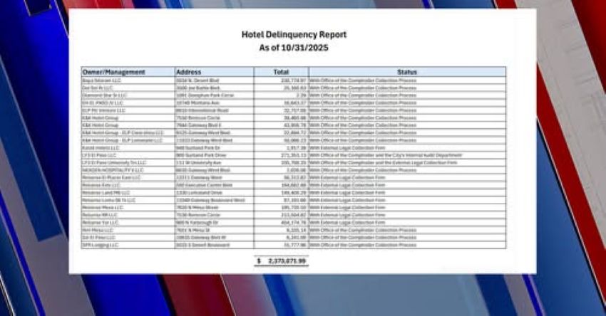 https://kvia.com/news/el-paso/2025/11/20/23-el-paso-hotels-owe-more-than-2-4-million-in-unpaid-occupancy-taxes-audit-finds/?fbclid=IwY2xjawPz1m1leHRuA2FlbQIxMABicmlkETFibmFHRG5NcjZLTUlYUXd1c3J0YwZhcHBfaWQQMjIyMDM5MTc4ODIwMDg5MgABHvLijeJ_q4xlvoXJ6JBb3aRTB09ZzOxNEWSwQLv8Wx1aJ-WH2E4myi-DHNCO_aem_ap6YEYGFLxtFMB27ZJvCuA