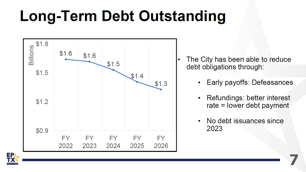 According to Cortinas, the debt principal decreased by $300 million because of early payoffs (including $53 million defeased from the failed Arena project), bond refundings for a better interest rate, and the fact that no debt has been issued since FY 2023.
