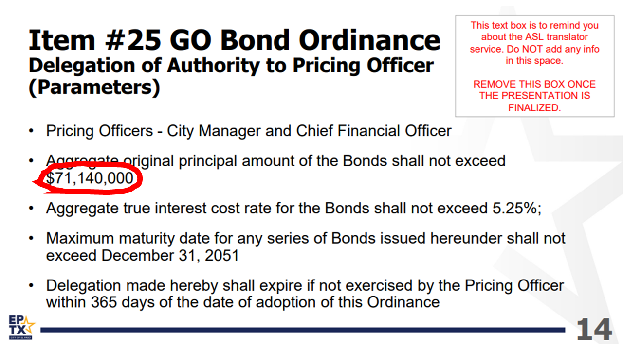City CFO Robert Cortinas will present agenda item 25 to City Council this Tuesday, April 14, according to which $71,140,000 in general obligation bonds will be issued.