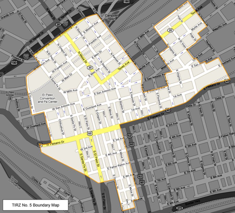 Tax Increment Reinvestment Zone (TIRZ) number 5 encompasses all of Downtown, the western part of the Segundo Barrio, and a portion of Central El Paso. Any incremental increase in tax revenue among the properties there is reinvested into the TIRZ rather than collected by the City for its General Fund. TIRZ 5 funds are supposed to be for improving the infrastructure of the area and addressing blight.