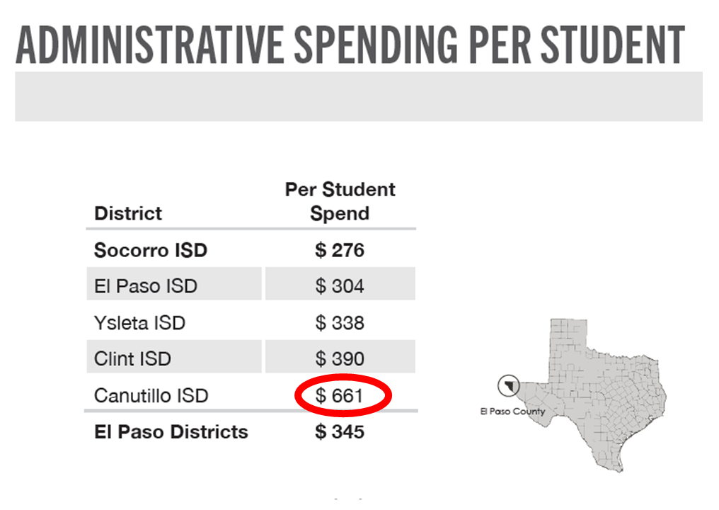 By a very wide margin, Canutillo ISD has the most bloated central administration, costing $661 per student, compared to $276 for Socorro ISD, $304 for El Paso ISD, $338 for Ysleta ISD, and $390 for Clint ISD.